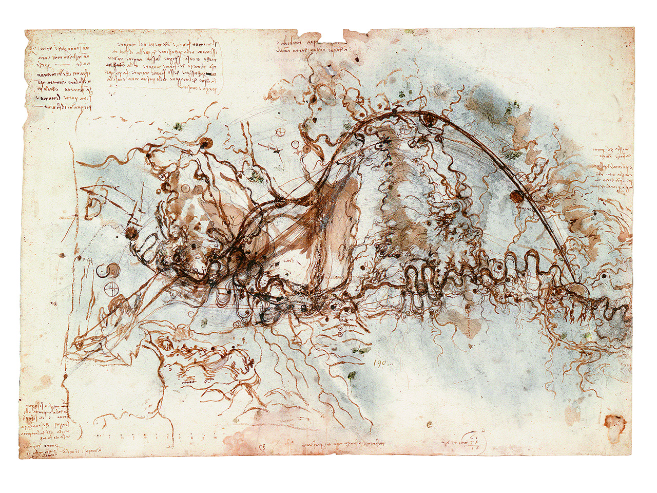 L’auteur est Leonardo da Vinci et l’étude remonte à 1504, dans cette époque Leonardo travaillait pour la République Florentine (il avait été appelé à Florence très probablement par Niccolò Machiavelli, le même qui signera en tant que contractant pour la deuxième chancellerie de la République Florentine le contrat de location du peintre pour la “bataille d’Anghiari” qui devait être peinte dans le Palazzo Vecchio). Cette étude est liée au projet de dérivation du fleuve Arno, comme on peut le lire tout en haut, au centre du dessin : “placement du fleuve Arno dans un canal “. Le canal que nous voyons (toujours au-dessus du dessin) était censé permettre aux Florentins non seulement de contourner le cours tortueux du fleuve entre Florence et Signa, mais aussi – et surtout – d’évincer la ville de Pise – avec qui Florence était en guerre – du cours du fleuve Arno en la privant de celui-ci et ses ressources.